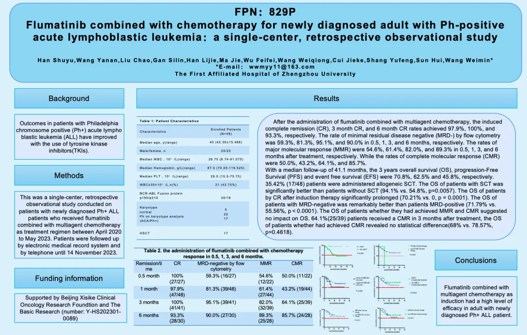 Wang Weimin et al. ESMO 2024 FPN:829P: Flumatinib combined with chemotherapy for newly diagnosed adult with Ph-positive acute lymphoblastic leukemia:a single-center, retrospective observational study.