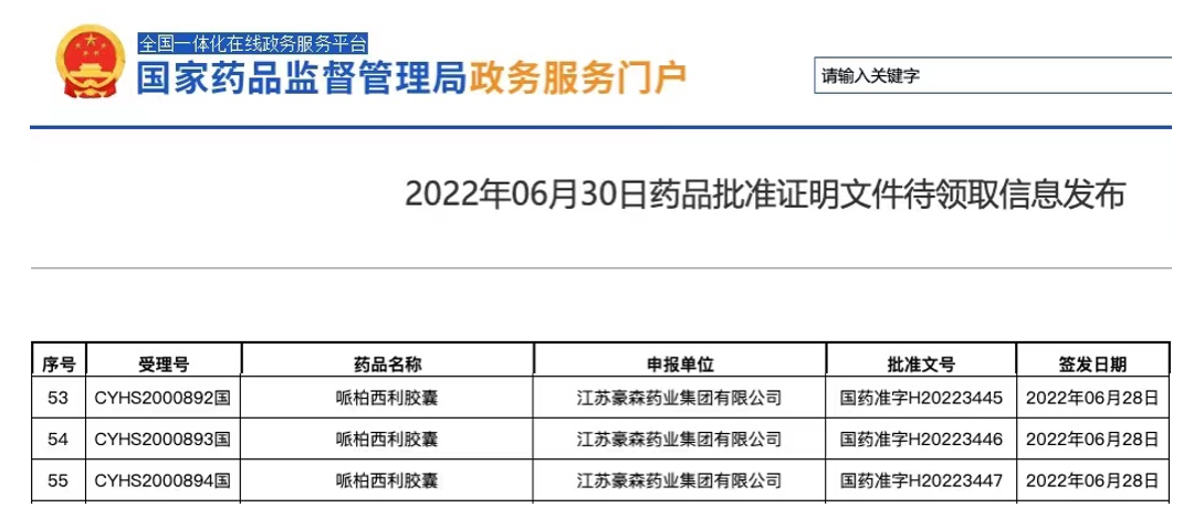 7月4日,翰森制药(代码:3692.HK)发布公告,其附属公司CQ9电子开发的抗肿瘤药物--哌柏西利胶囊获得国家药品监督管理局(NMPA)颁发的药品注册证书,适用于激素受体(HR)阳性、人表皮生长因子受体2(HER2)阴性的局部晚期或转移性乳腺癌,与芳香化酶抑制剂联合使用作为绝经后女性患者的初始内分泌治疗。